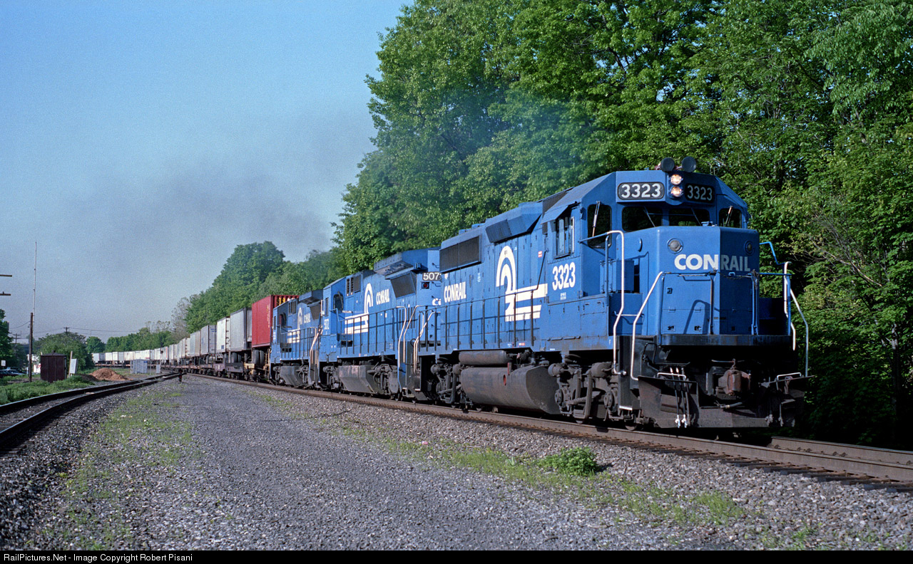 One of the hottest trains on Conrail's River Line was TVLA. It handled a solid TOFC consist from North Bergen, NJ to Los Angeles, CA via a connection with the Santa Fe at Corwith Yard in Chicago (where it became QNYLA). TVLA was scheduled to depart North Bergen at 7:30am and usually did so on time. In the spring and summer months it was possible get a bit of sun on the nose in places as the train headed north. TVLA is seen here motoring through CP7 in Bogota at 8:00am on the nose, laying down a hazy trail of exhaust in the process. No doubt the River Line dispatcher was working to keep the train moving along at track speed. 3-4 four-axle units was the norm on TVLA in the early 90s.