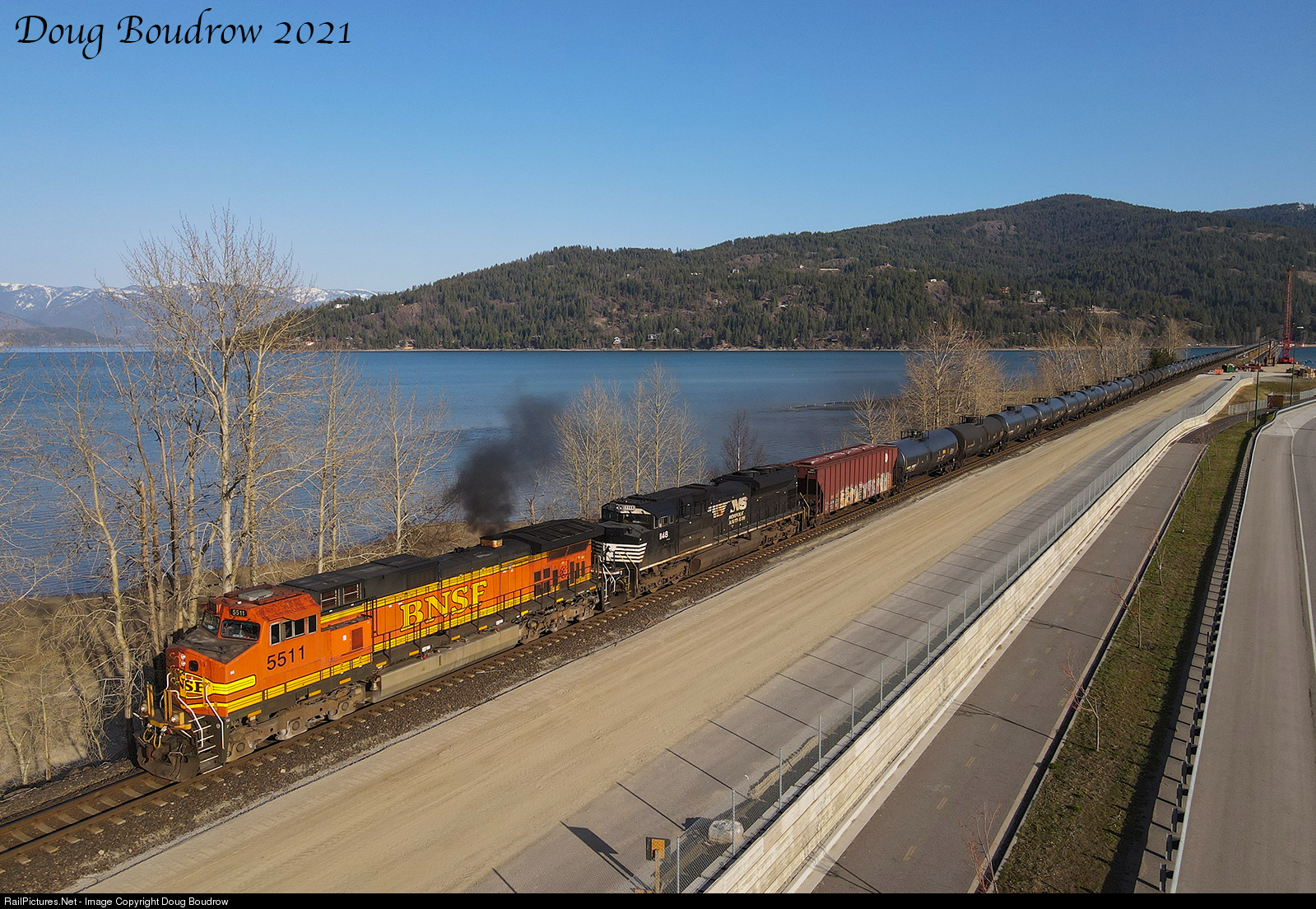 | An Eastbound tank train is seen just after crossing Lake Pend Oreille in Sandpoint, Idaho. The widened right of way and the crane in the background are part of the ongoing project to double-track the line and reduce congestion at the "funnel." |