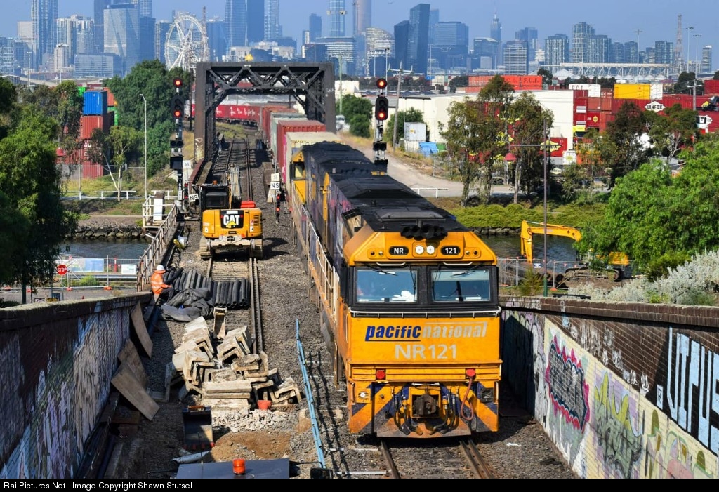 | Pacific National's NR121 and NR40 trundles towards the Bunbury Street Tunnel, Footscray Melbourne with 4MC2, Container Service bound for Griffith, N.S.W...