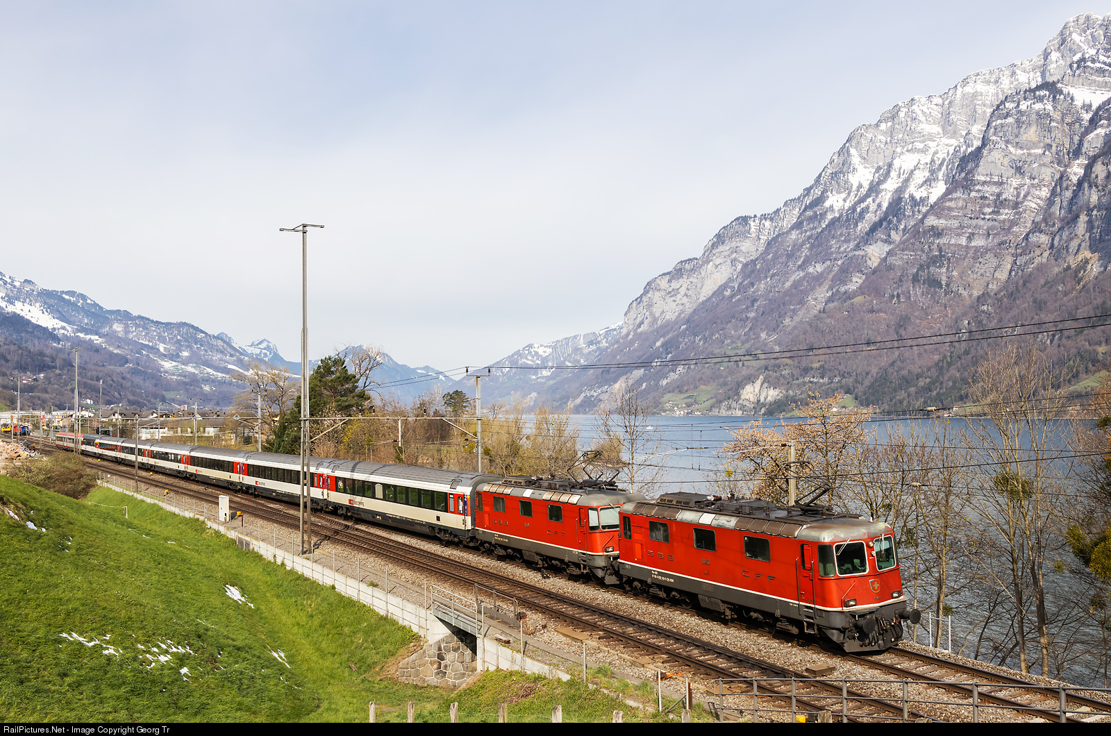 Re 420 # 143 (Re 4/4 II # 11143) and Re 420 # 149 (Re 4/4 II # 11149) in multiple control are pulling the Eurocity 163 from Zürich via Sargans-Buchs-Feldkirch-Innsbruck-Bischofshofen-Selzthal to Graz, a journey of nearly 12 hours. The train is rolling along the Walensee between Unterterzen and Walenstadt, with the Churfirsten mountains in the background. Most cars of the train are of the SBB, including a panorama car, in the rear are two cars of the austrian ÖBB. The SBB locomotives are in charge till the swiss/austrian border station Buchs SG.
