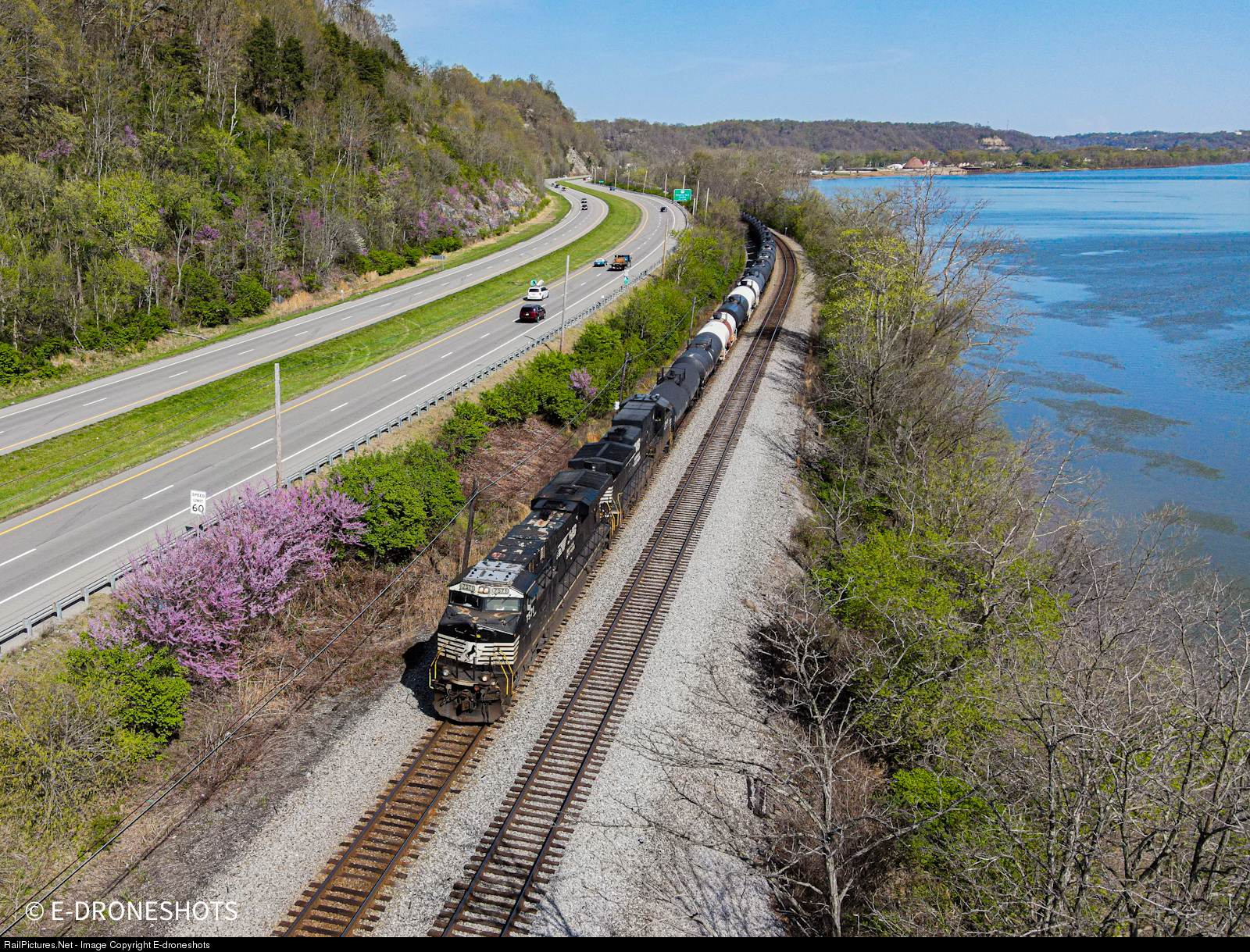 Running along the Ohio River at track speed this NS freight passes some beautiful spring scenery in Hanging Rock Ohio.
