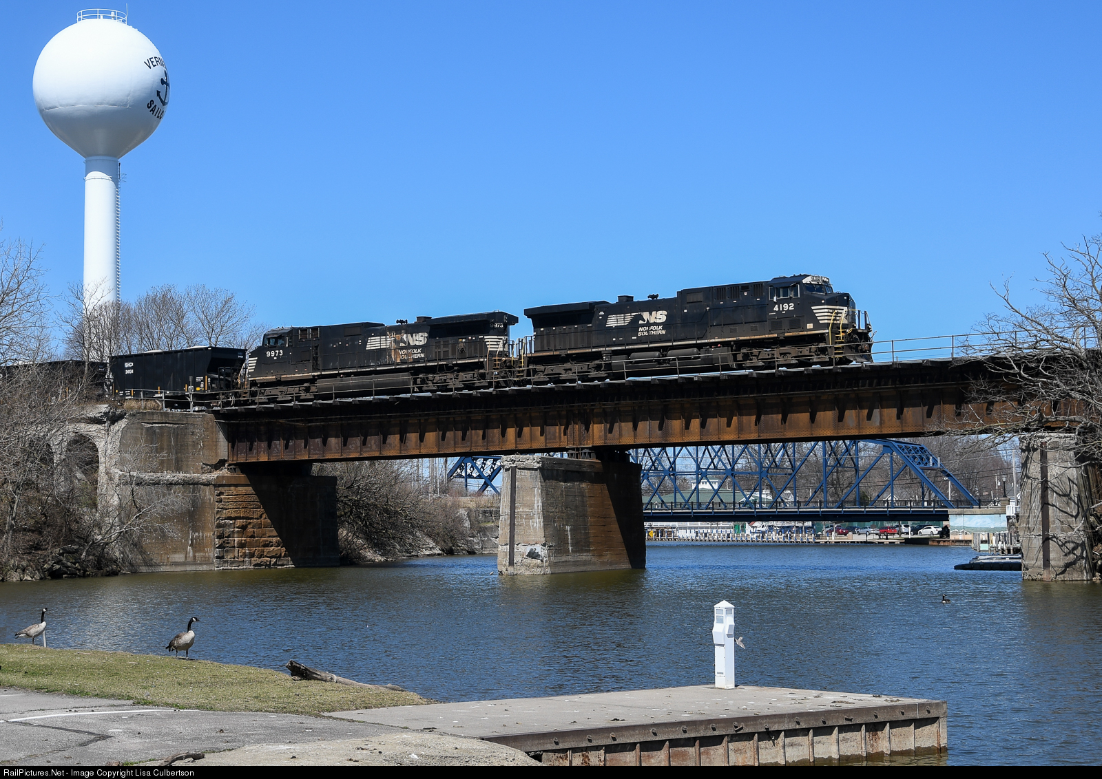| The NS 68D, an as needed stone train, crosses the Vermilion River Bridge in Vermilion, Ohio. |