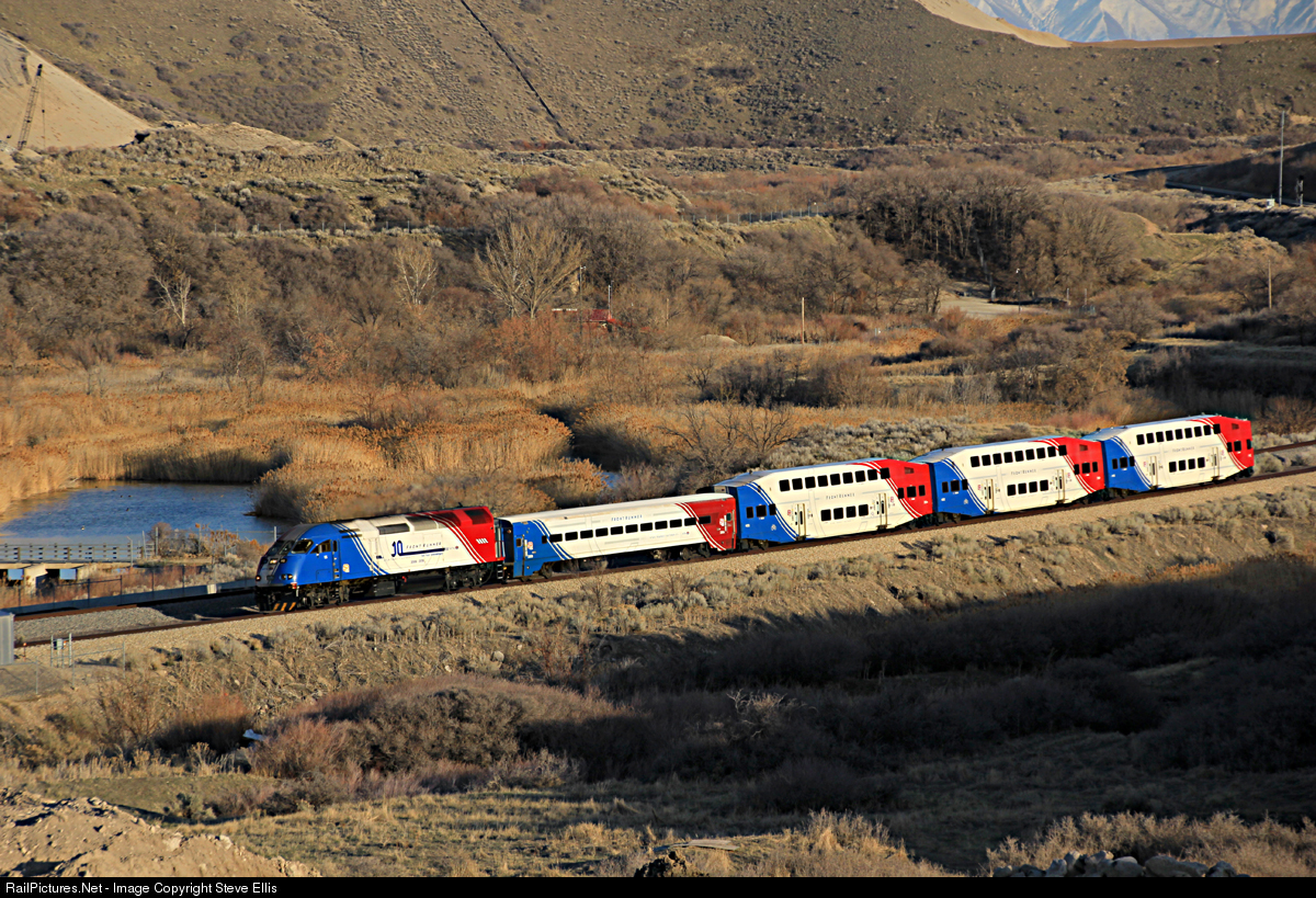 UTA Front Runner number 15, wears a bit of a special scheme. Sporting a 10 years of Front Runner commuter trains.