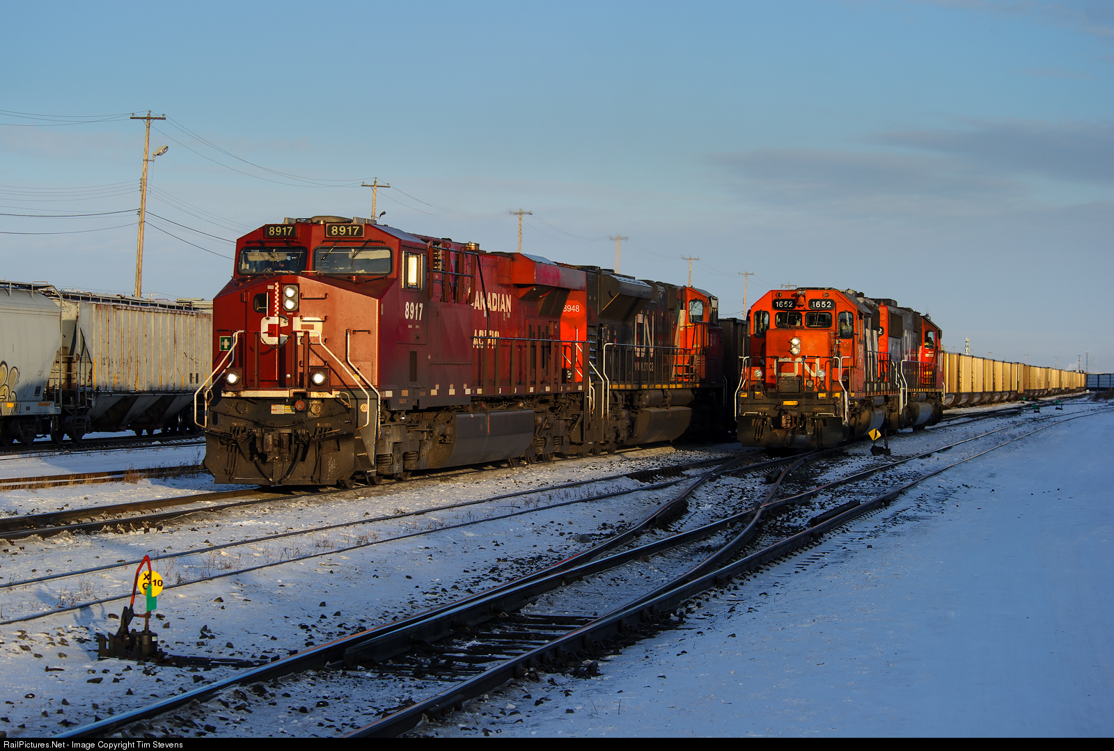 | In an unlikely meet, CP ES44AC 8917 is pulling CN train L52253 16 through the middle of Walker Yard passing ex NAR, now CN SD38-2 1652 working on the 1555 Hump Yard beltpack job. |