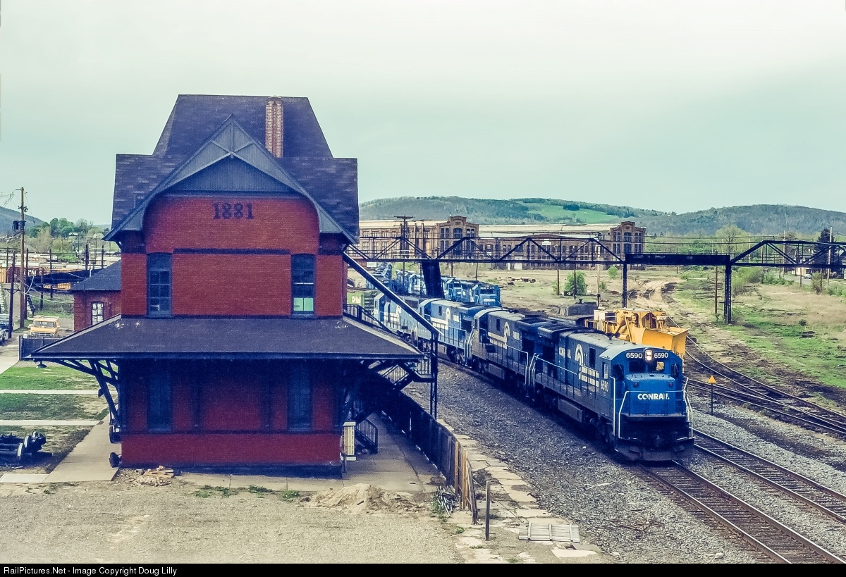 Conrail train CGAL (Corning, NY - Allentown, PA) passes the former Lehigh Valley station in the LV shop town of Sayre, Pennsylvania. The yard and engine servicing facilities are gone, but the massive locomotive erecting shops can be seen in the distance. They have since been razed.
