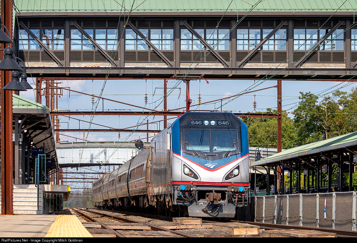 AMTK No. 648 leads a long distance train west through Levittown, PA, ducking the pedestrian bridge of the newly (2019) rebuilt station.
