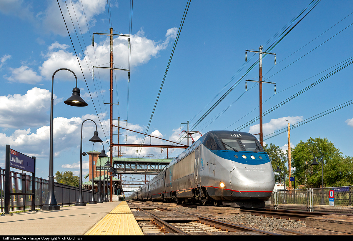 Amtrak's sleek Acela makes a high speed pass through Levittown, PA, passing the station while en route to 30th Street Station in Philadelphia.