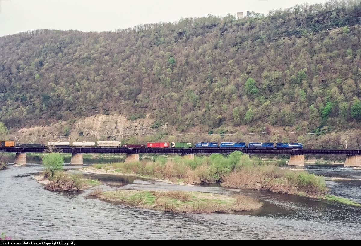 Three C30-7A’s and a GP38-2, typical power for Conrail train CGAL (Corning, NY - Allentown, PA) lead the train across the Susquehanna River at Towanda, Pennsylvania. This view is still possible today, but tree growth on the island in the river blocks several cars.