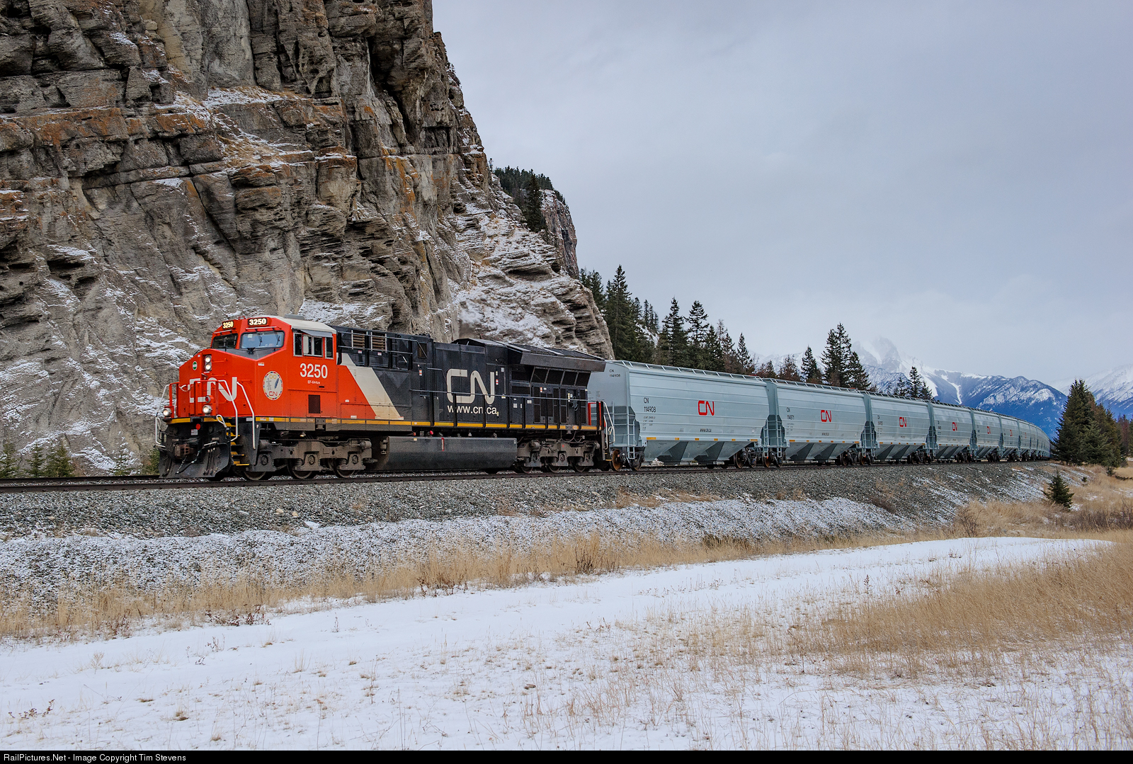 With 120 brand new CN grain cars built by Trinity Railcar in Mexico trailing, CN ET44AC 3250 leads Maymont, SK - Vancouver Thornton, BC train G863 west.