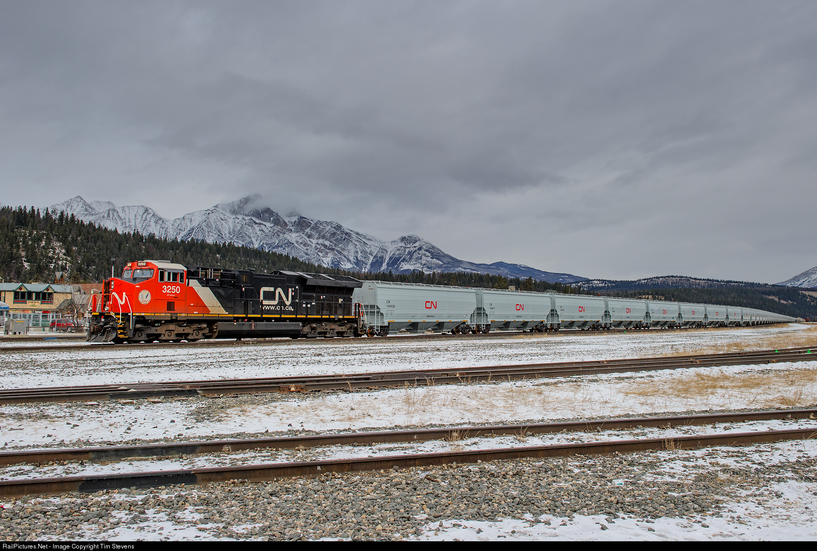 With 120 brand new CN grain cars built by Trinity Railcar in Mexico trailing, CN ET44AC 3250 leads Maymont, SK - Vancouver Thornton, BC train G863 into Jasper, AB for a crew change.