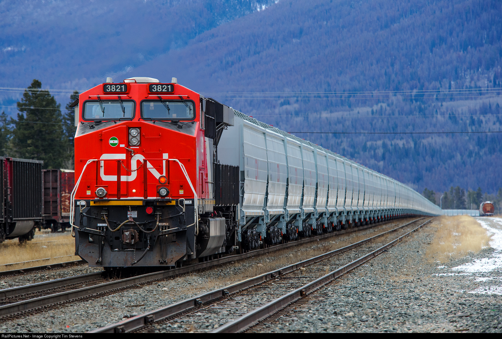 CN ES44AC 3821 brings up the rear of 120 brand new CN grain cars in Jasper.