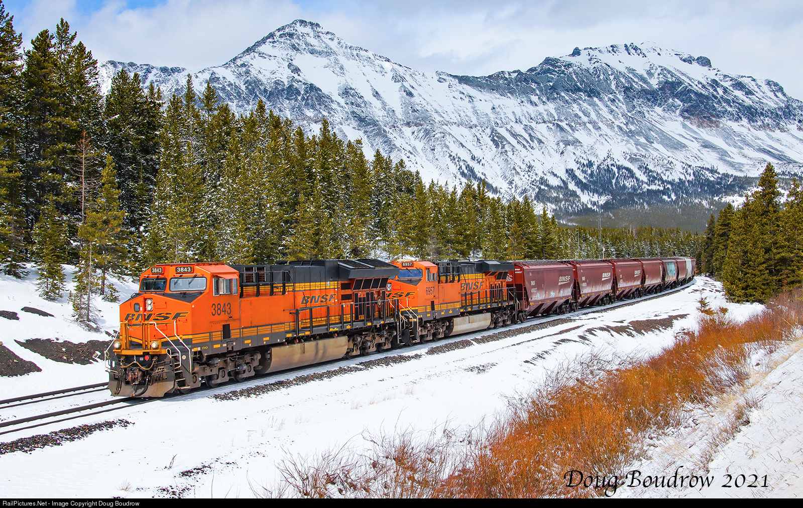 A Westbound unit grain train is seen just after cresting the 5,213-foot summit at Marias Pass. Summit Mountain, which has a peak of 8,770 feet is seen in the background on the right. The 8,609-foot peak of Little Dog Mountain is on the left. John F. Stevens first explored the pass in 1889, hired by James J. Hill to engineer the Great Northern Railway over the Continental Divide. By comparison, Marias is much lower than other points across the divide.