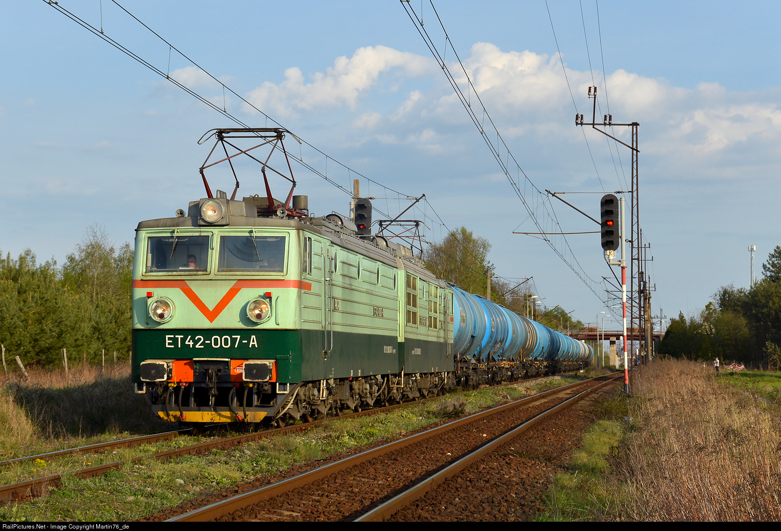 | The double section electric locomotive ET42-007 hauling a freight train (tank wagons with molasses) from Chałupki to Małomice. The train left the Popielów station. |