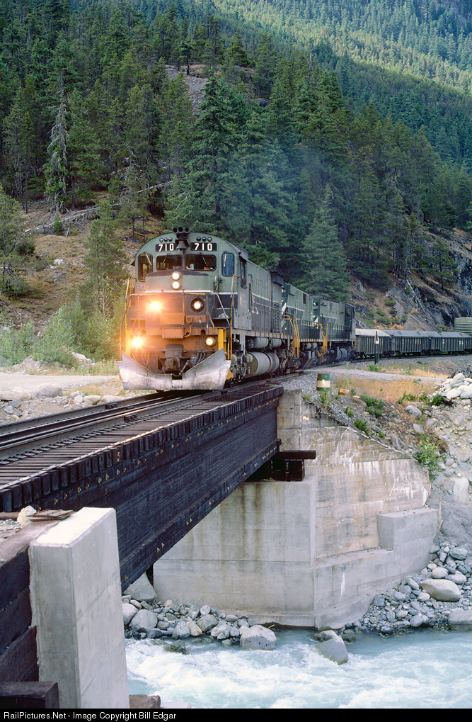 British Columbia Ry. M630 no. 710 leads a trio of MLW power on a southbound train south of Pemberton, BC. This wood bridge was rather unique. My best guess is it was at Rutherford Creek not far south of Pemberton, but it could be somewhere else between there and Alta Lake area.
