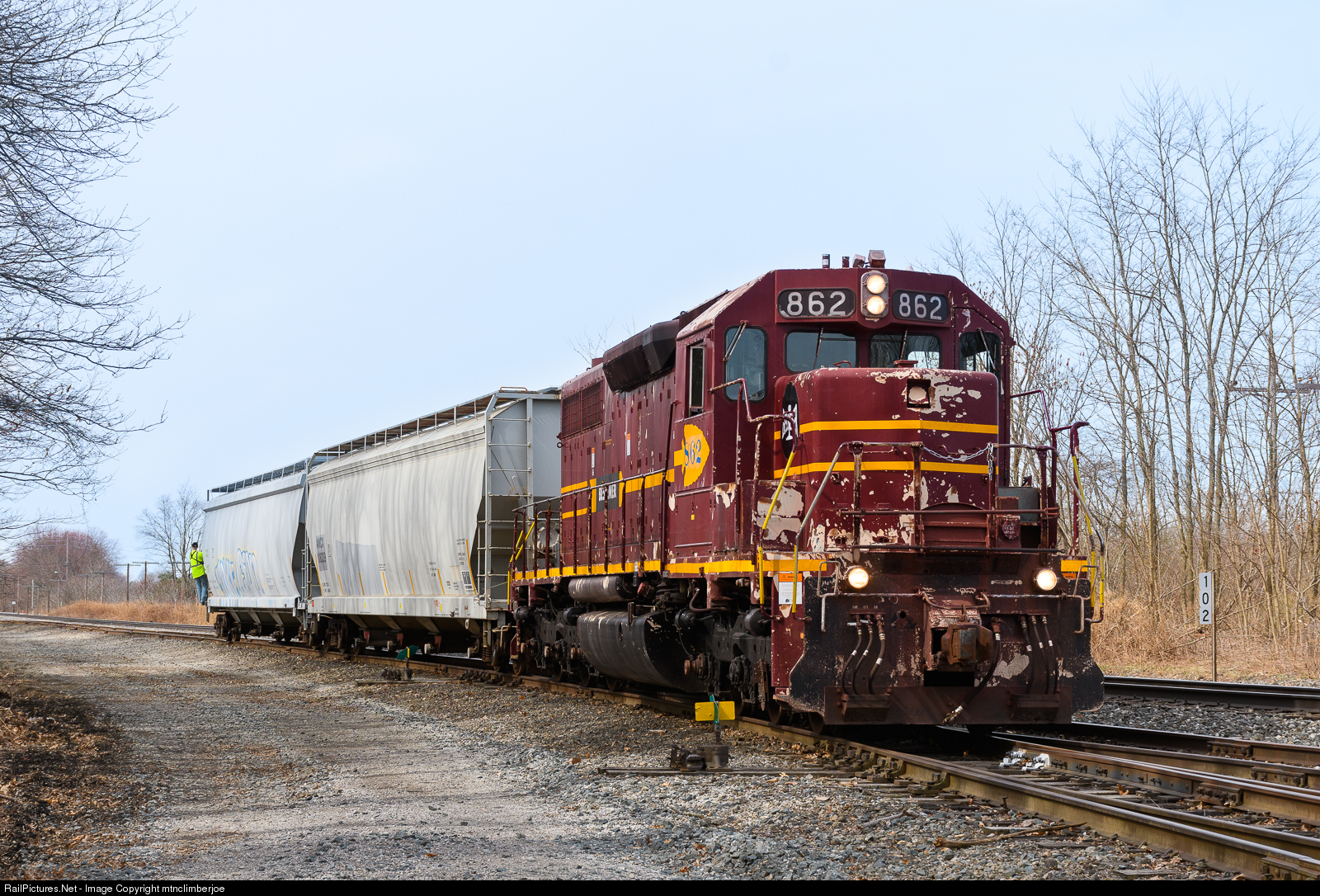 After completing the interchange with NS at Wallace Junction in Girard, Pennsylvania, CN L523 makes the shove back towards EMSCO with two covered hoppers. The sole power for this move is BLE 862, an ex-DMIR SD38 that still wears DMIR paint, albeit with some major chipping from years of work at the Conneaut Docks.