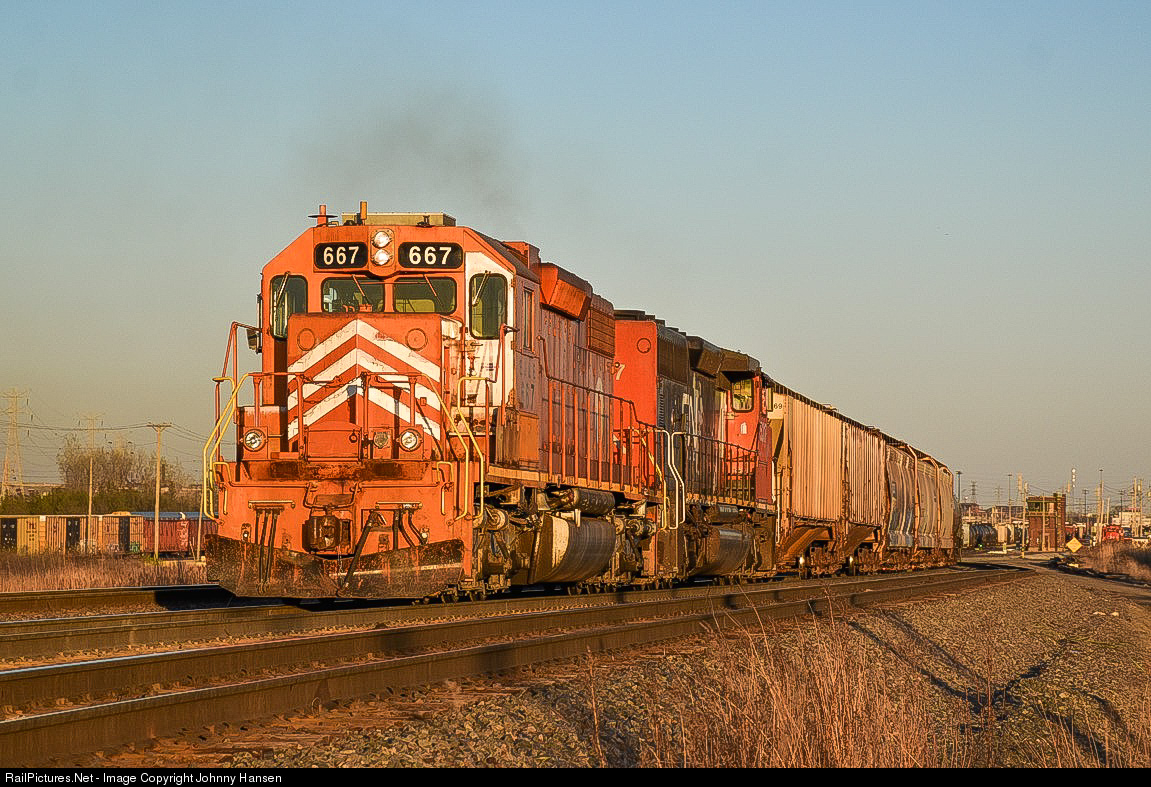 | In some amazing golden hour sunlight, EJ&E 667 leads a pulldown job out of the west end of EJ&E’s, now CN’s Kirk Yard in Gary. |
