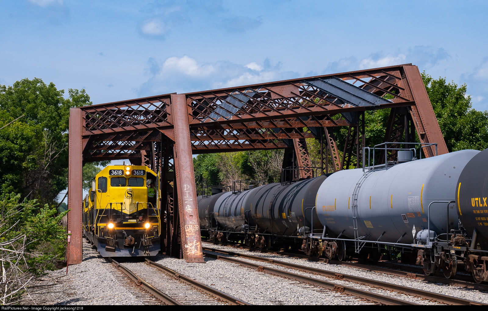 After picking up cars in Solvay, NYSW CL-1 builds its train in their yard in Syracuse, NY as it passes through the truss bridge over Erie Boulevard with EMD SD45-2 3618 leading.