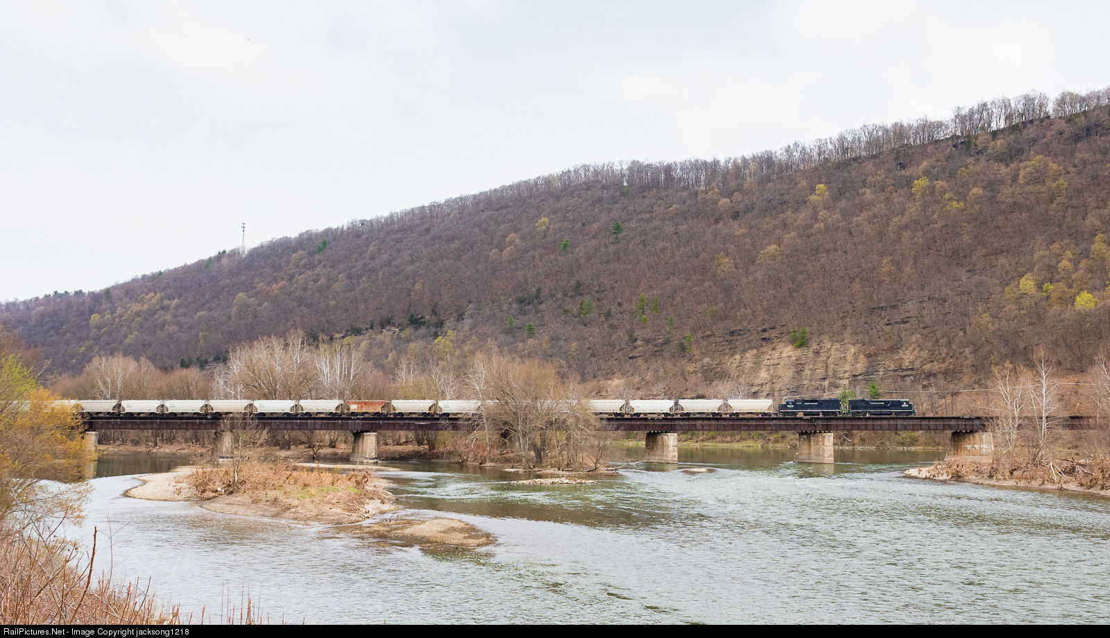 Lehigh Railway U23B number 2300 and GP40-2 number 3002 take a cut of loaded sand cars south as they cross over the Susquehanna River in Towanda, PA.