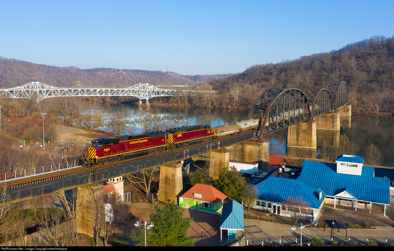 Serving the greater Pittsburgh area, the Carload Express owned Allegheny Valley Railroad has recently acquired new power in the form of ex-Norfolk Southern SD60M's. On a sunny March morning, one of these newly arrived units is on the point of AVR-06 as it makes a shove move across the Monongahela River from Homestead, PA to Glenwood, PA after working Glav Tech on the south side of the river. The train will return to the yard and pick up cars for interchange to the Wheeling & Lake Erie before heading south once again.