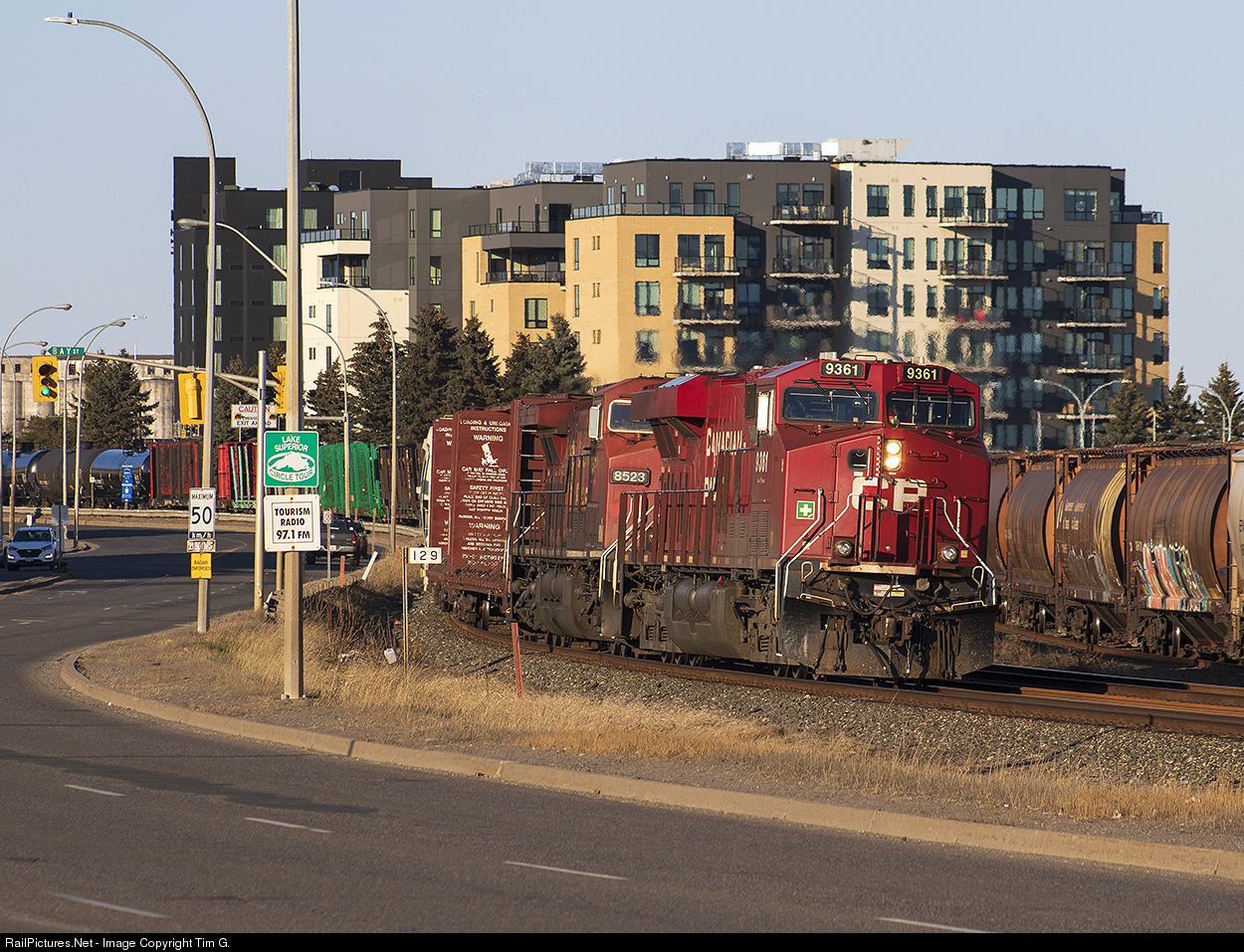 | Backdropped by the new waterfront condo's and Delta Hotel located at Prince Arthur's landing, add to plan extra "intermix" traffic 9-119 arrives in Thunder Bay and snakes along Water St and around CN's Port Arthur Yard. |