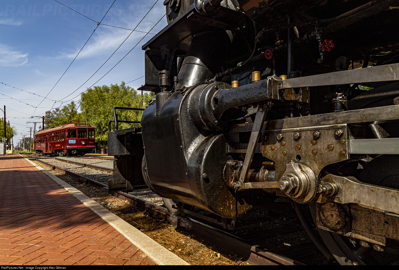 The valve gear of Ventura County Railway No. 2, a now 99-year-old 2-6-2 built by the Baldwin Locomotive Works in 1922, enjoys a brief rest between runs as a Pacific Electric trolley, No. 717, takes its turn to run out onto the Southern California Railway Museum's mainline.