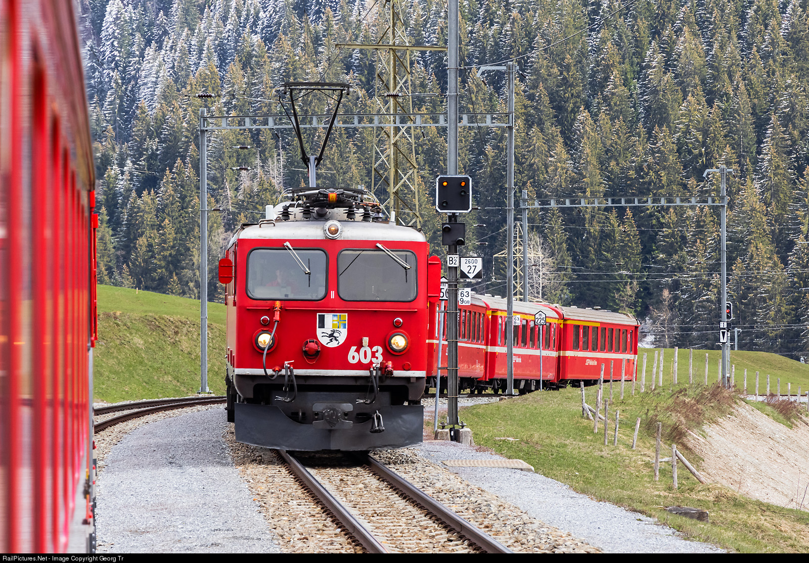 | The oldest locomotive of the Rhaetian Railway in regular service, Ge 4/4 I # 603 "Badus" built in 1947, was in the Regio Express service between Scuol-Tarasp and Disentis-Mustér this day. She is entering Rabius-Surrein with the RE 1741 from (Scuol-Tarasp-) Landquart to Disentis-Mustér, crossing with the RE 1744. |