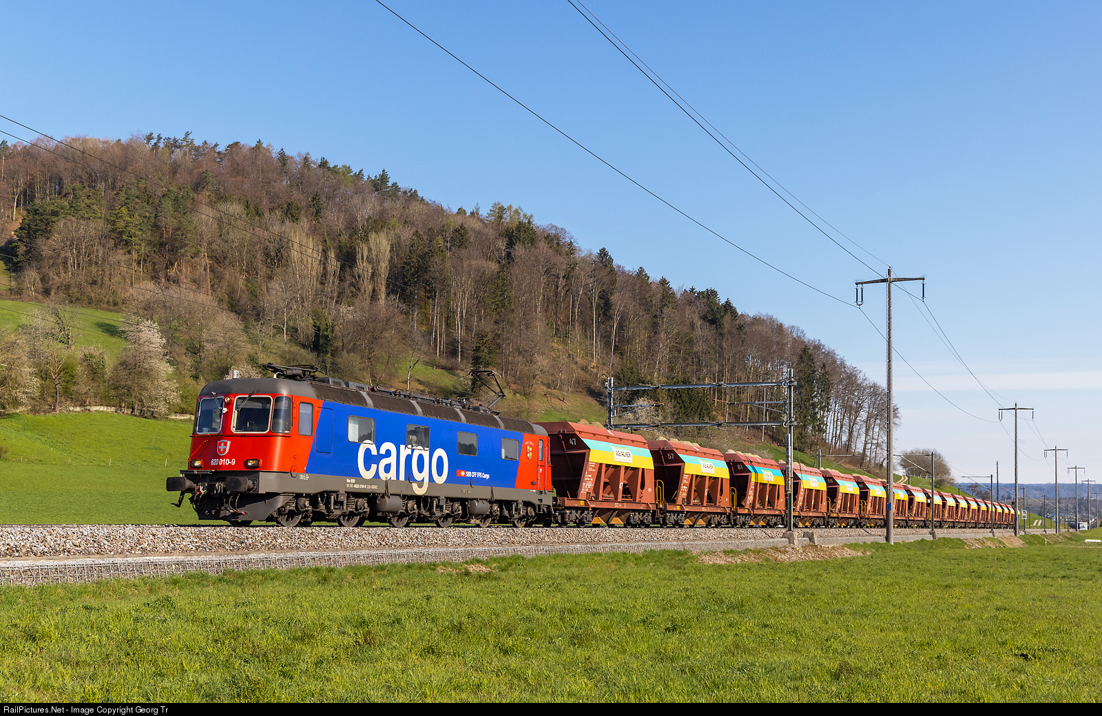 Re 620 # 010 (Re 6/6 # 11610) "Spreitenbach" is pulling the 1600 ton "Weiacher" (Eberhard group) gravel train 69729 from Zweidlen via Bülach-Zürich Altstetten-Lenzburg-Suhr-Zofingen to Rothenburg, between Eglisau and Glattfelden.