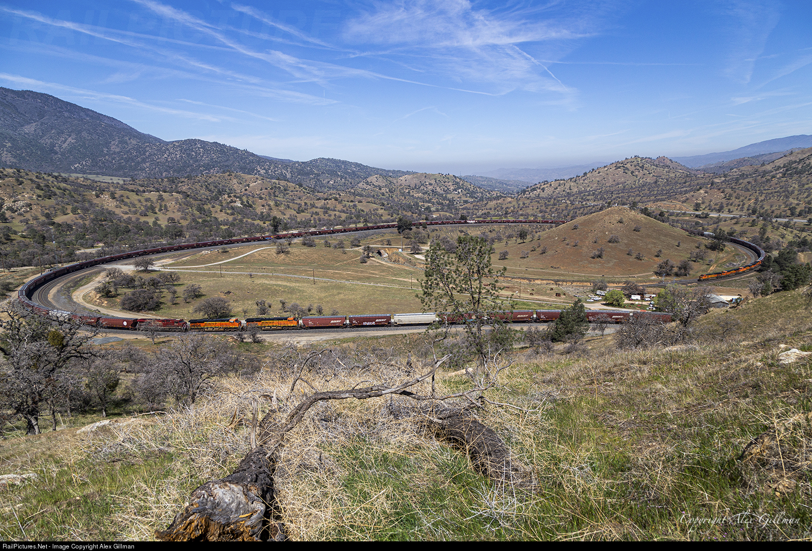 | BNSF 5193 and the head-end power on this northbound grain train begin their final decent down toward Walong and Tunnel 9 and the train's three mid-train DPU's, including a Canadian visitor, still have quiet a ways to go to complete their crossing of the loop. |