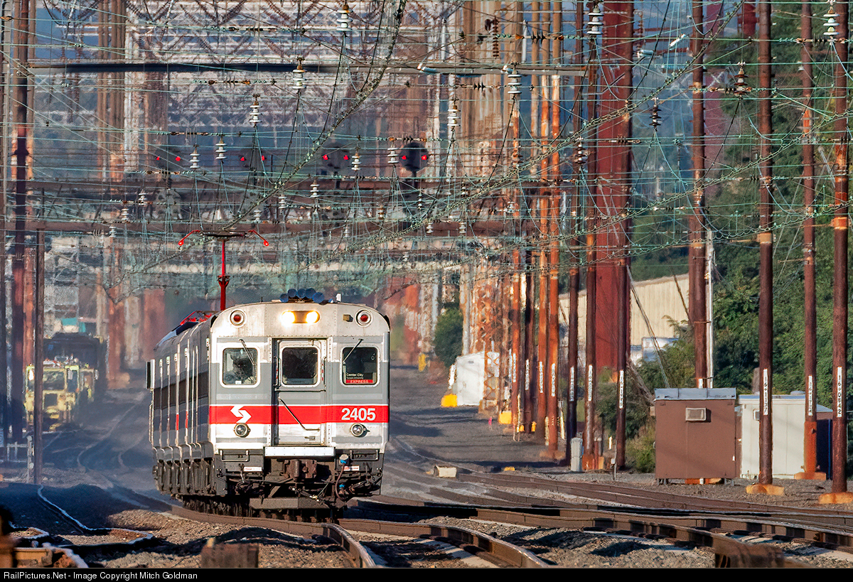 | A SEPTA push-pull commuter set, led by No. 2405 climbs a grade out of Marcus Hook, PA on an approach to the Highland Avenue station in Chester. |