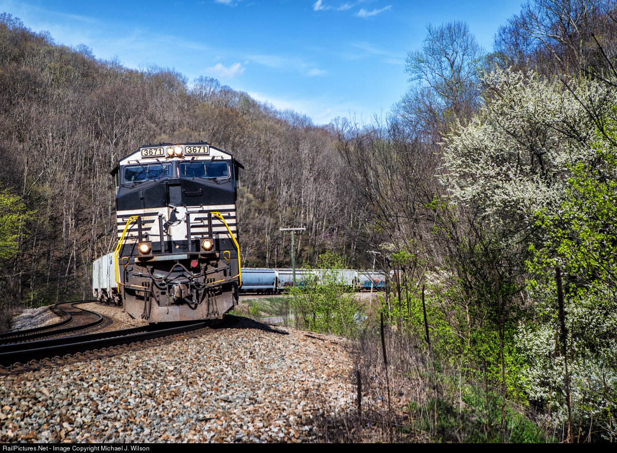 | Spring has arrived to Norfolk Southern's Christiansburg District as NS 195 led by ET44AC #3671 grinds her way upgrade to Bluefield, WV on the afternoon of April 16, 2021. |