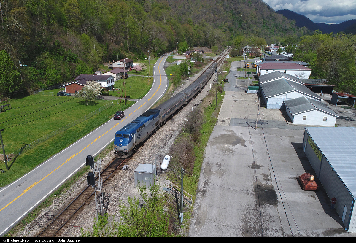 Amtrak 50, the eastbound "Cardinal," approaches the interlocking at Mt. Carbon, the beginning of a brief stretch of single track on the former Chesapeake & Ohio Newport News-Cincinnati main line across West Virginia. Just ahead lies the incredibly scenic New River Gorge.