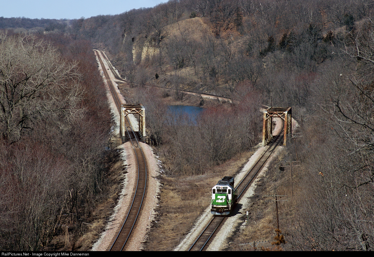 A Burlington Northern local heads to East Dubuque light engine and passes milepost 172 at the twin truss bridges over the Sinsinawa River west of Portage, Illinois, on April 3, 1993. This location is on the BN main line along the Mississippi River between Savanna and East Dubuque.