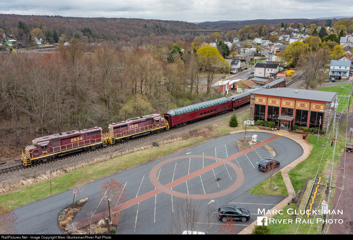Art Imitating Life. The White Haven Area Community Library in White Haven, Pennsylvania is housed in a restoration and repurposing of the 1899 Lehigh Valley Railroad Engine House. Bricks in asphalt trace the location of the turntable that once sat in what is now the parking lot. On Saturday, April 17, 2021, a Reading & Northern Railroad (Reading, Blue Mountain & Northern Railroad/RBMN) Maintenance of Way Office Car Special (OCS) sits on the adjoining track with GP39RNs 2534 and 2535 leading the traditional 3 car train on a round trip from Port Clinton, Pennsylvania to Pittston, Pennsylvania. While these cars primarily serve the OCS, they are occasionally offered as the consist on public excursion, and have mostly been seen operating with R&N's F Units in the past year.
