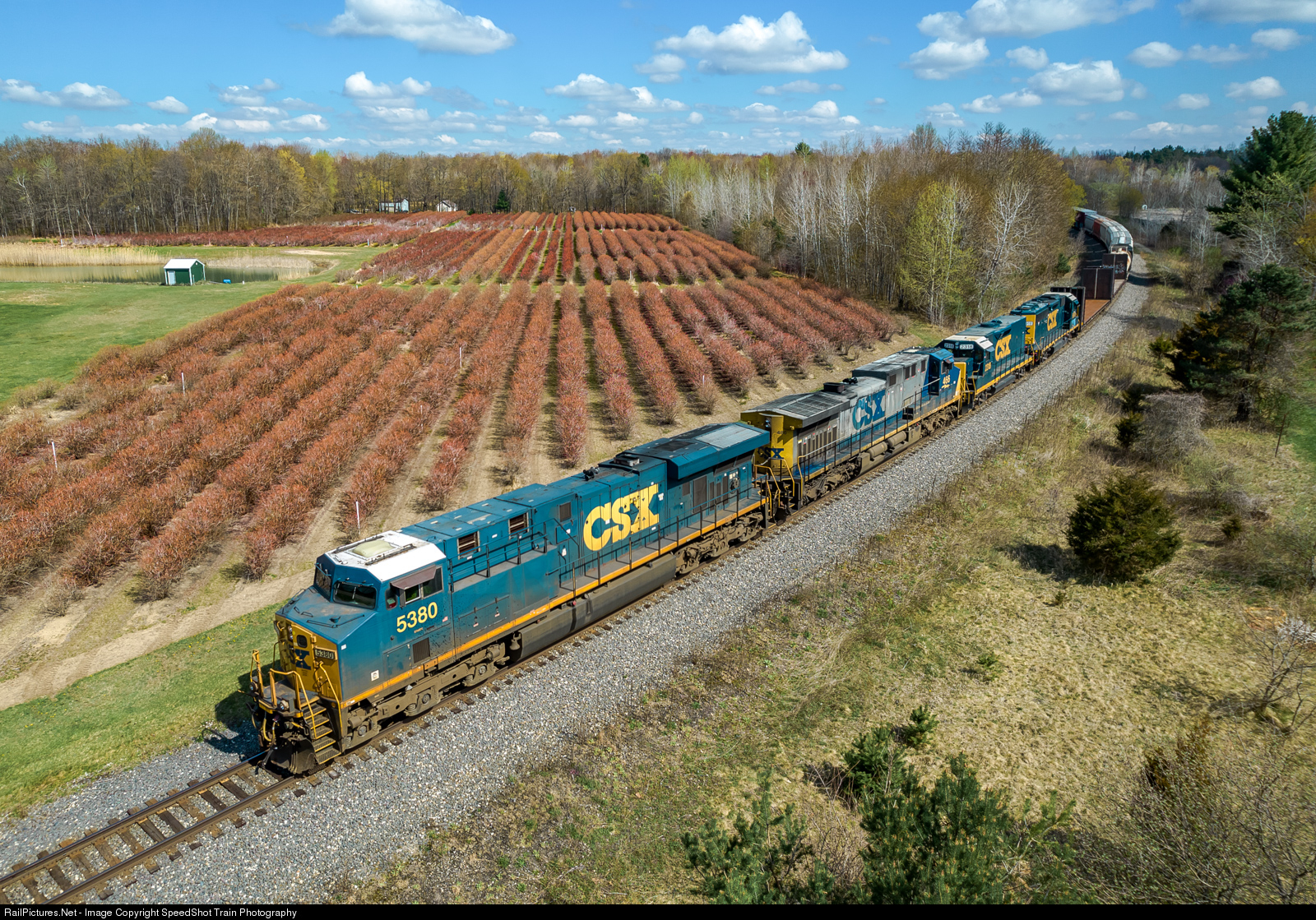 | CSXT 5380 Leads a four unit manifest to Chicago Illinois from Grand Rapids Michigan. The last two locos are headed to service in Illinois. Here the train rounds the curve in Breedsville Michigan Westbound next to a blueberry farm in the background |