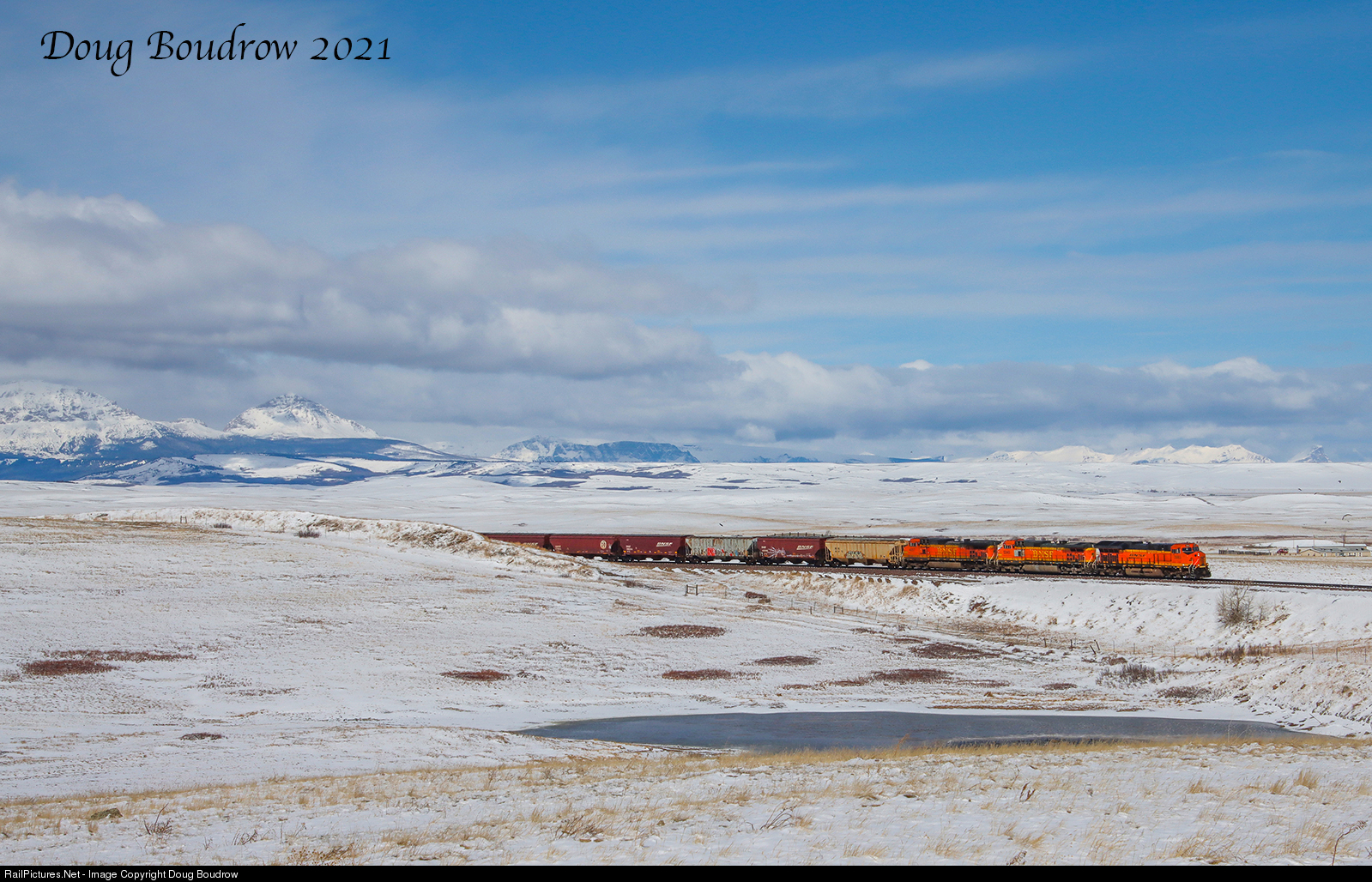 | An Eastbound BNSF empty grain train is seen at the sharp curve just outside Browning, Montana. The train will pass through the small town that lies in the Blackfoot Indian Reservation before continuing across the high plains. |
