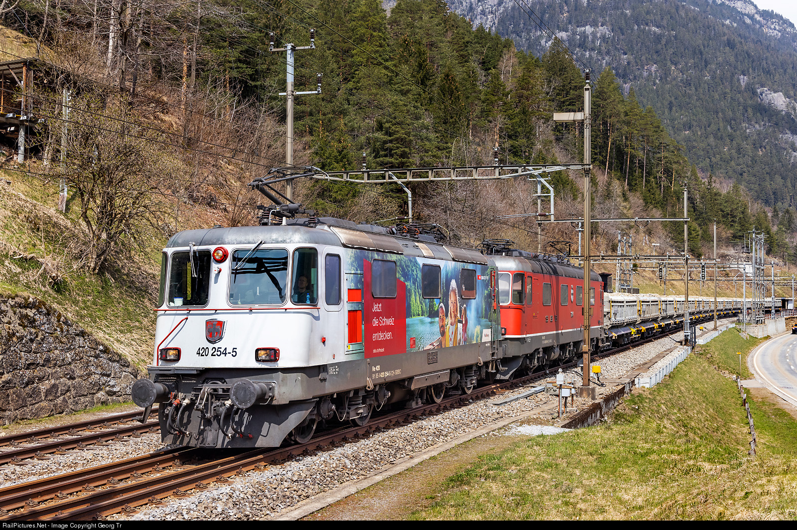 Re 420 # 254, in the special paint scheme for "Jetzt die Schweiz entdecken", and Re 620 # 064 of the SBB in multiple control,("Re 10/10") are pulling the loaded excavation train 67654 from Ambri-Piotta over the Gotthard mountain line to Flüelen, through Wassen.