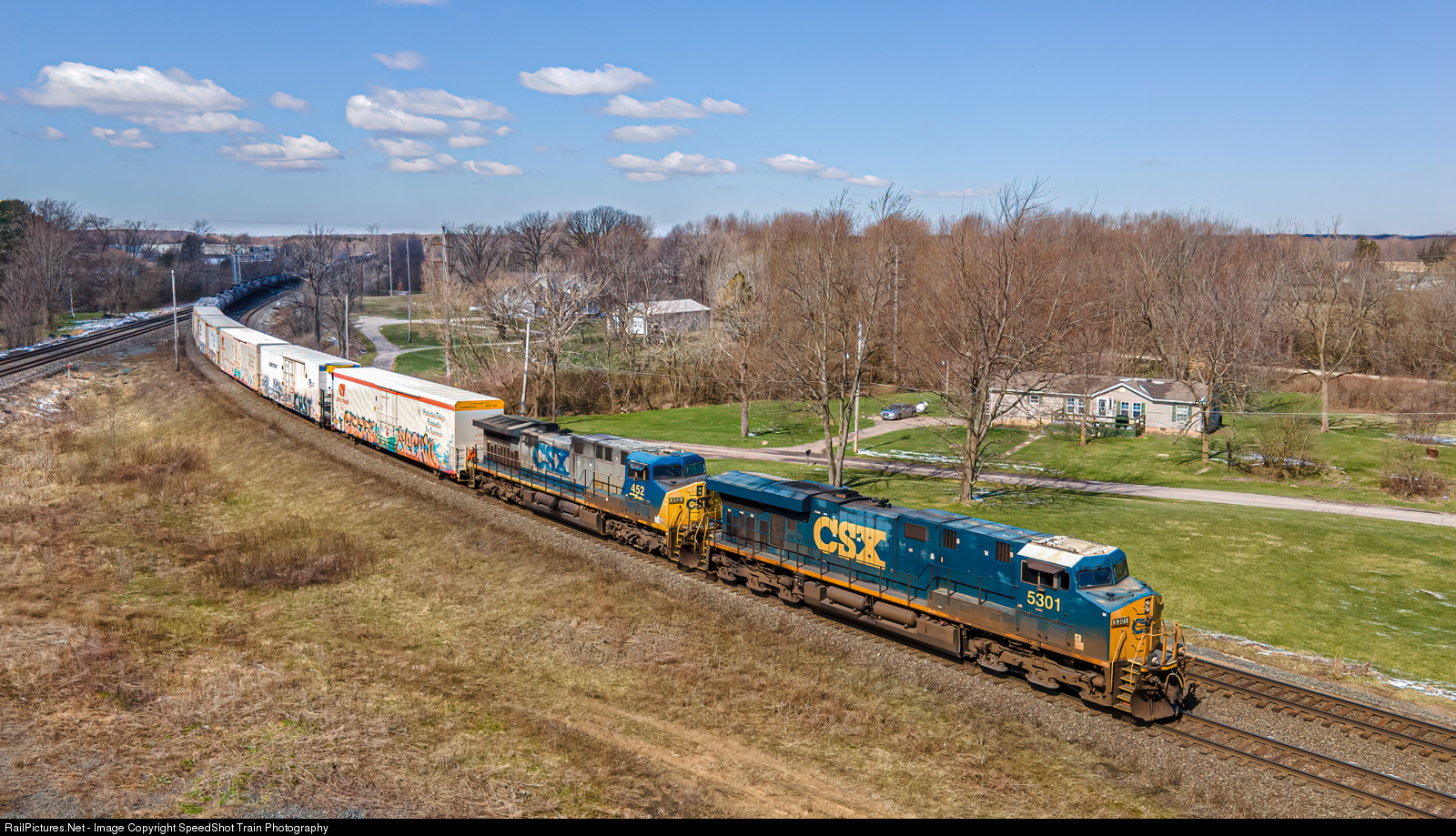 | CSXT 5301 Leads a two unit manifest Eastbound on a cold Saturday spring morning through Greenwich Ohio , after a snowfall overnight |