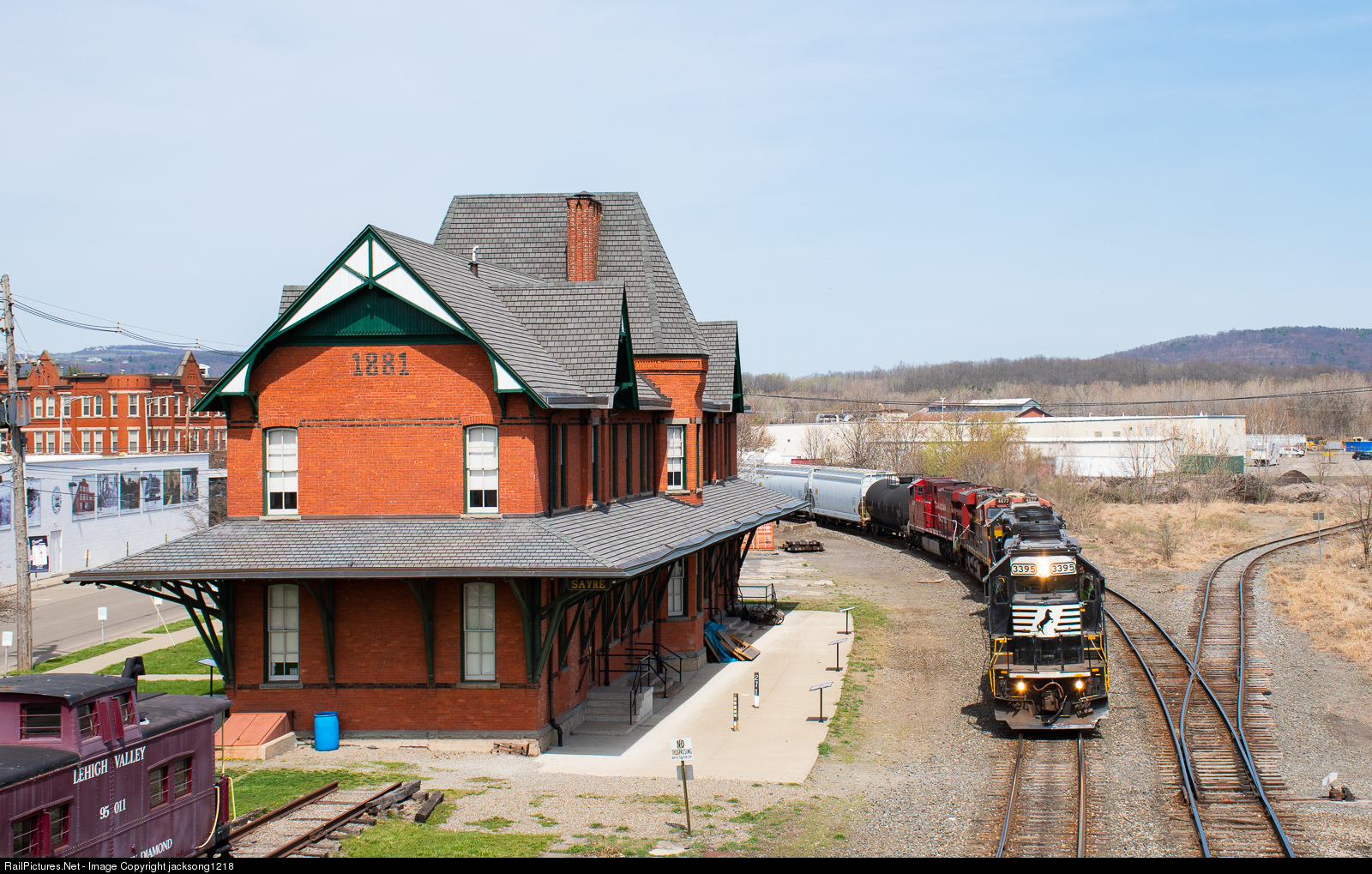 | Norfolk Southern local train H16 eases southbound into the Lehigh Railway interchange yard in Sayre, PA as it passes the historic 1881 Lehigh Valley station. They would do a swap with the Lehigh Railway here, dropping off over a hundred loaded sand cars and picking up 220 empties. The KCSdM and CP Gevo's would then be coupled to the unit sand train in Gang Mills, forming a westbound 69N. |