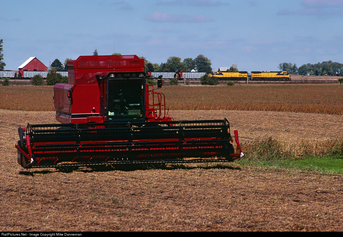 An eastbound Chicago & North Western coal train passes through farmland west of De Kalb, Illinois, on October 9, 1994. A shiny, new combine stands idle for a moment as a farmer takes a break during harvest time.