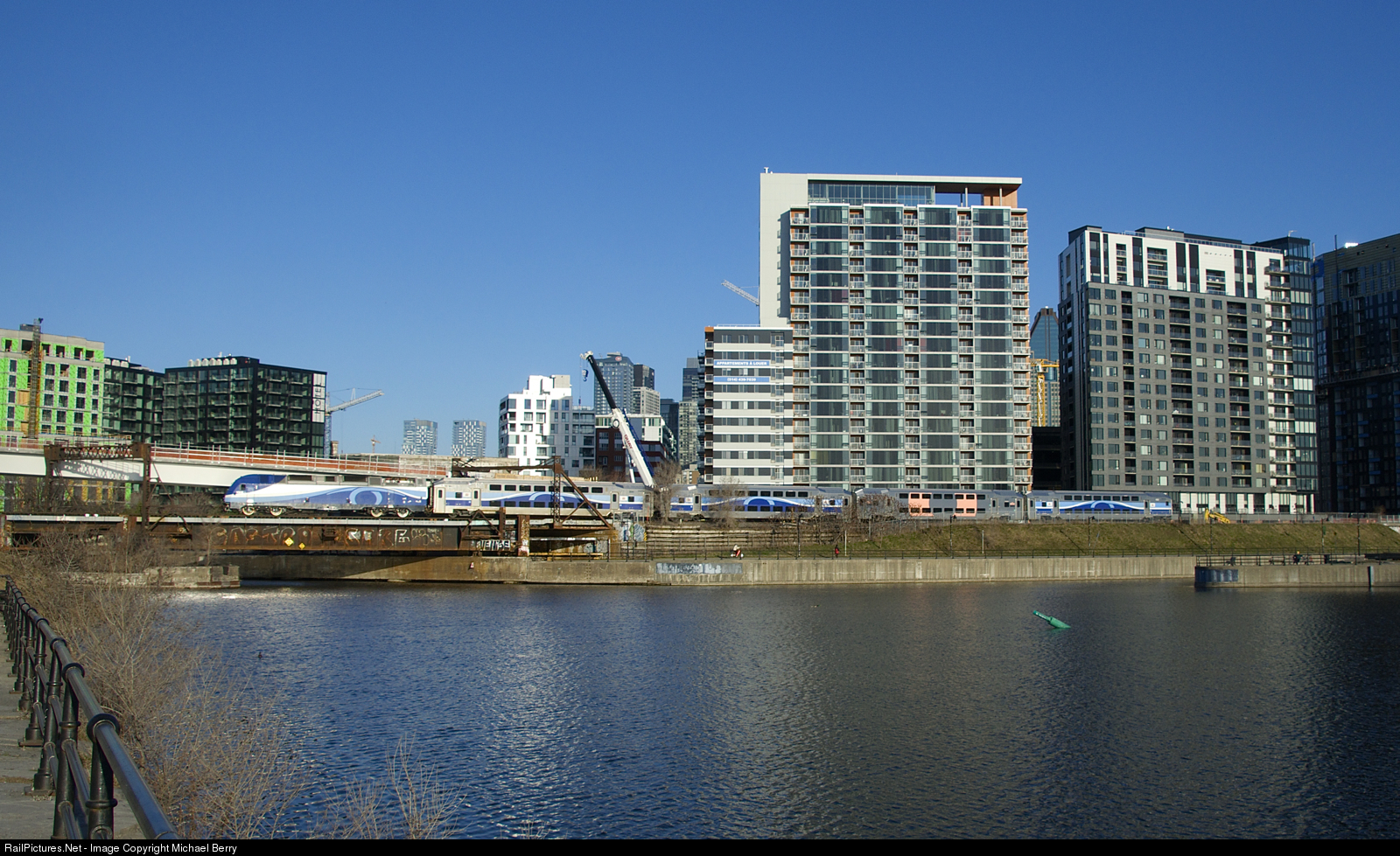 | One of the few repainted EXO cars is in the consist of EXO 805 as it passes the Peel Basin during the morning rush hour. This train used to run with eight cars, but is now half that size with pandemic level passenger volumes. |