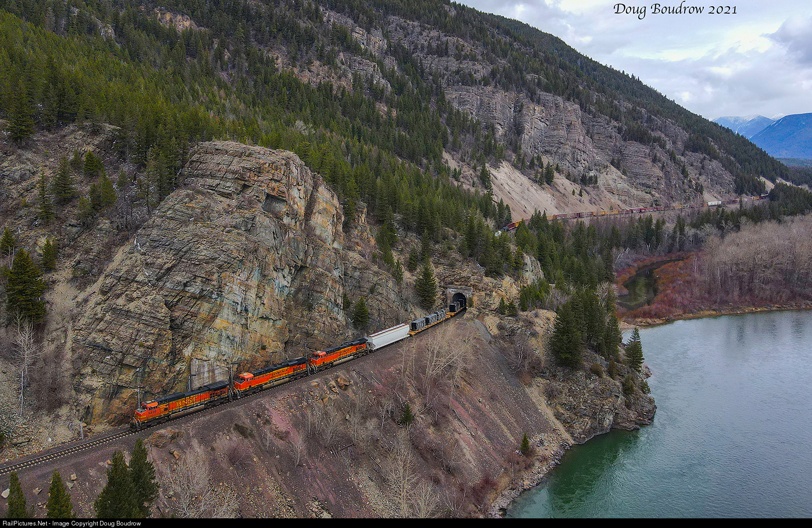 | A Westbound manifest freight train is seen snaking through Bad Rock Canyon between Hungry Horse and Columbia Falls, Montana along the Middle Fork of the Flathead River. |