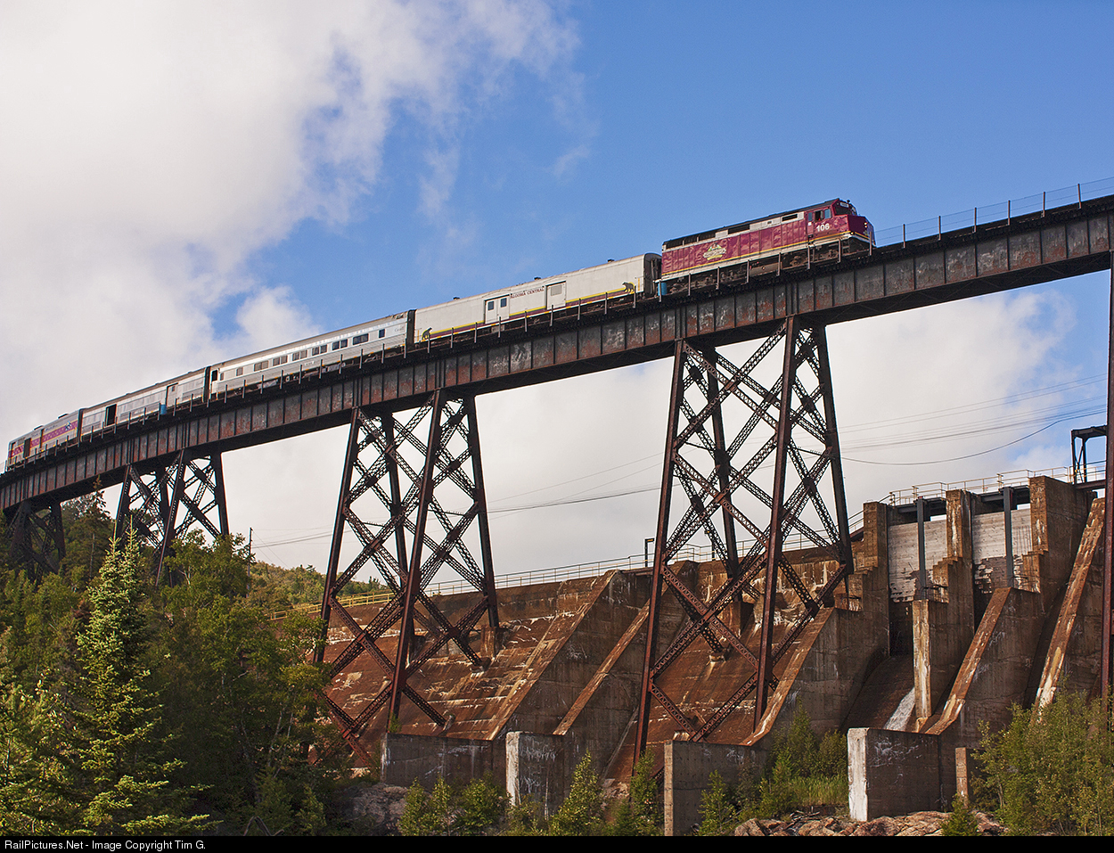 The Southbound "Tour of the line" crawls over the impressive 1550' curve deck bridge spanning the Montreal River and power dam which encases the base of the trestle. This once regular Sault Ste. Marie-->Hearst and return passenger service; a vital lifeline to the lodges, camps, and communities along the mostly inaccessible 296 mile line which carves its way north through Algoma country, hasn't operated since 2015. Lets hope that changes with the change of ownership.