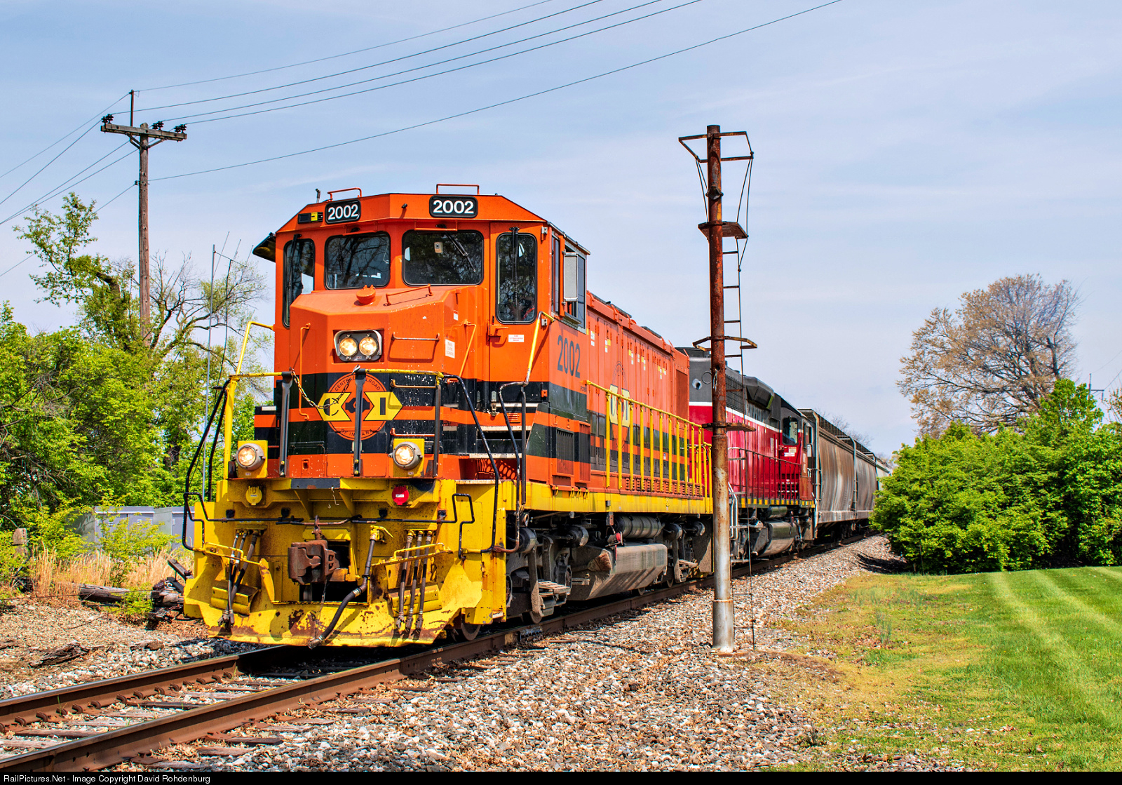 | The Indiana & Ohio's NS Interchange Job, train I703-19, rolls past the former location of the CP AMBER signals in Amberley Village on the I&O's Oasis Subdivision. The train started out the previous night, but had to change crews in the NS yard in Sharonville after the original crew ran out of time. Powering the train is RP20BD No. 2002 from I&O sister road Central of Indiana (CIND) and an I&O SD40-2 still wearing the red and gray RailTex era colors. |
