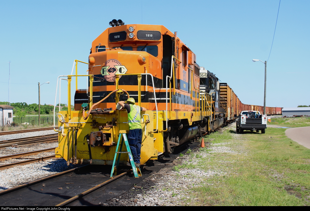 | A First Coast Railroad employee changes out the MU cable on the FCRD 1810 in the Fernandina Beach, Florida. Behind the FCRD 1810 is former Norfolk Southern 5564, which is now wearing FURX markings. Note the very small lettering on the FCRD 1810 number board. Photo taken with permission. |