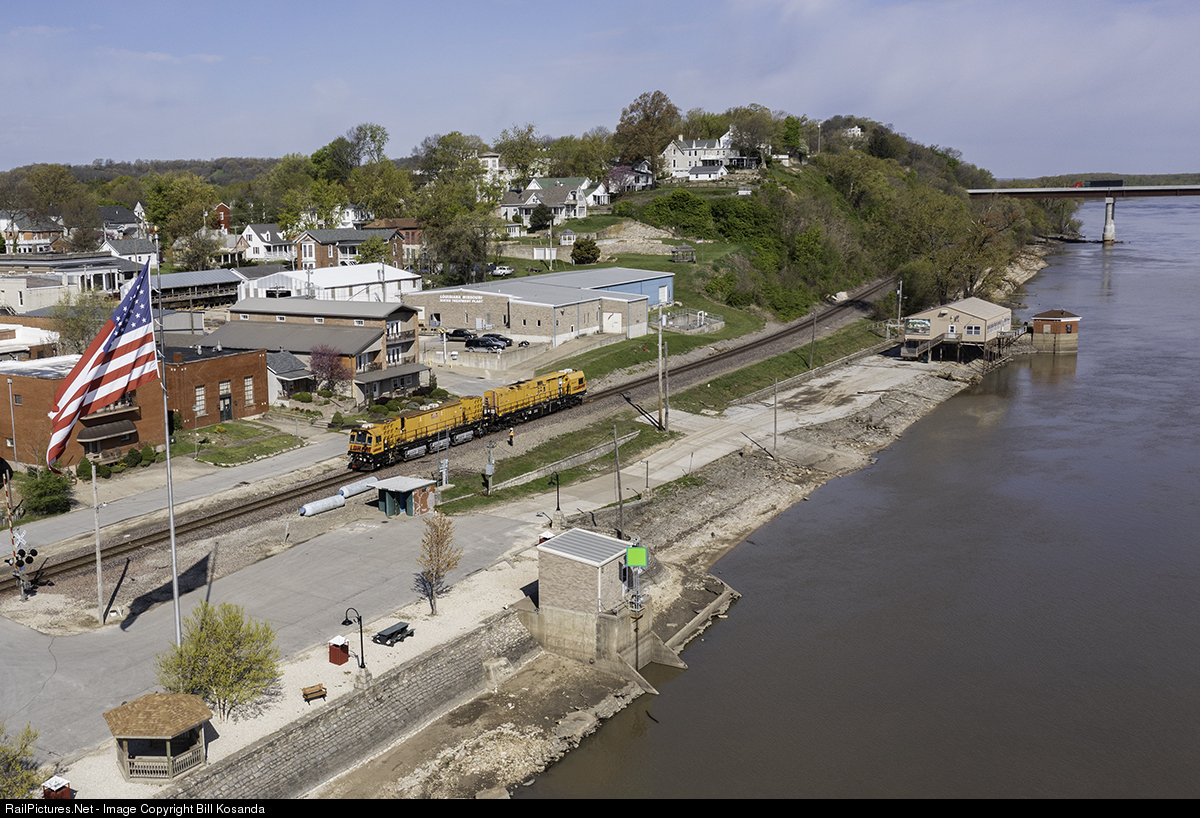 A LORAM Rail Grinder passes back and forth over a section of track at Louisiana, Missouri. This is the BNSF Hannibal Subdivision on the banks of the Mississippi River.