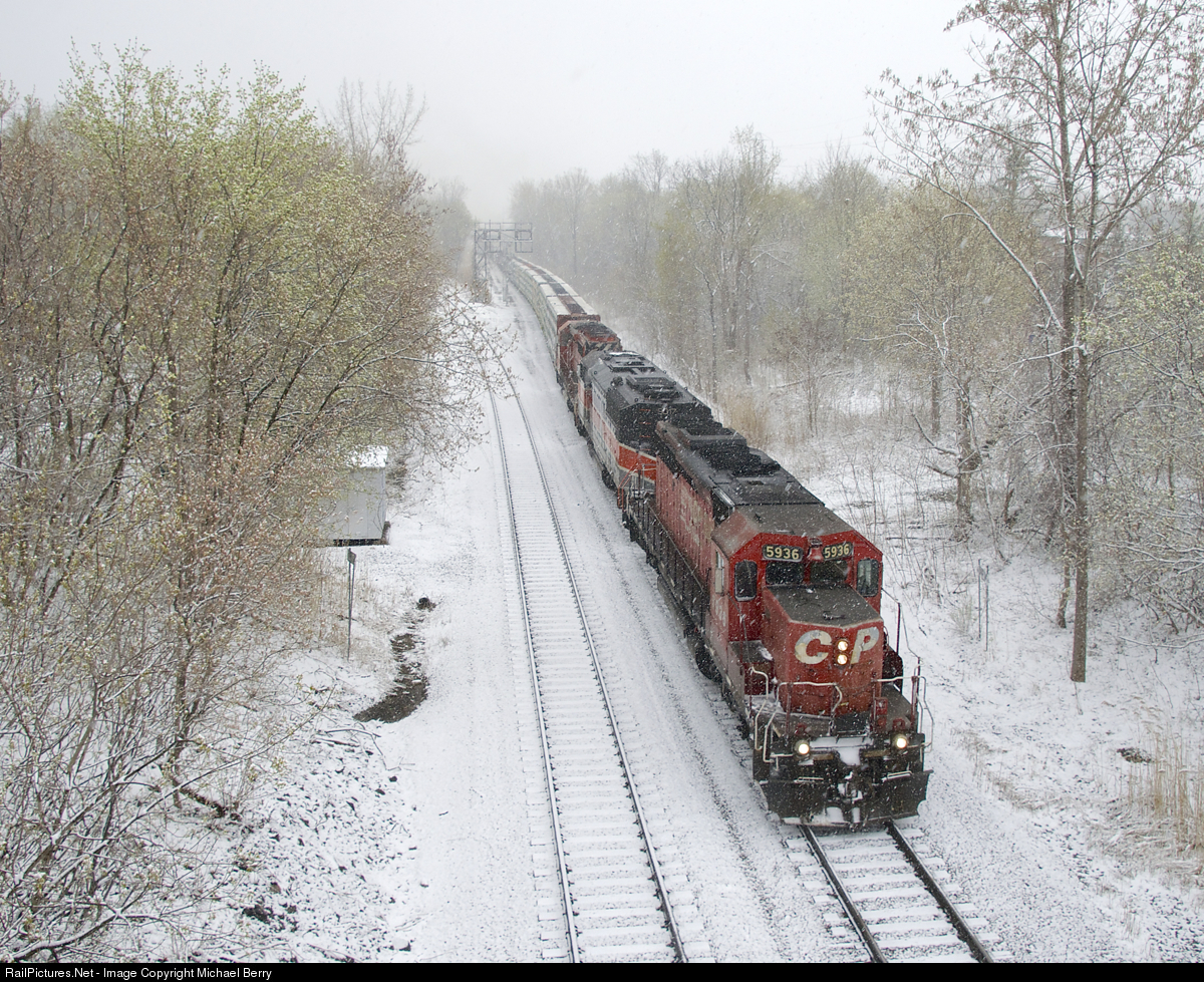 | EMD's in the snow. Snow is falling as CP 251 passes North Jct with an all-EMD lashup (CP 5936, CMQ 9017 & CP 6018). CP 251 has gone back to mostly having GE power, so this was a nice surprise. The snow was a not as nice surprise, but it does make for a nice photo. |