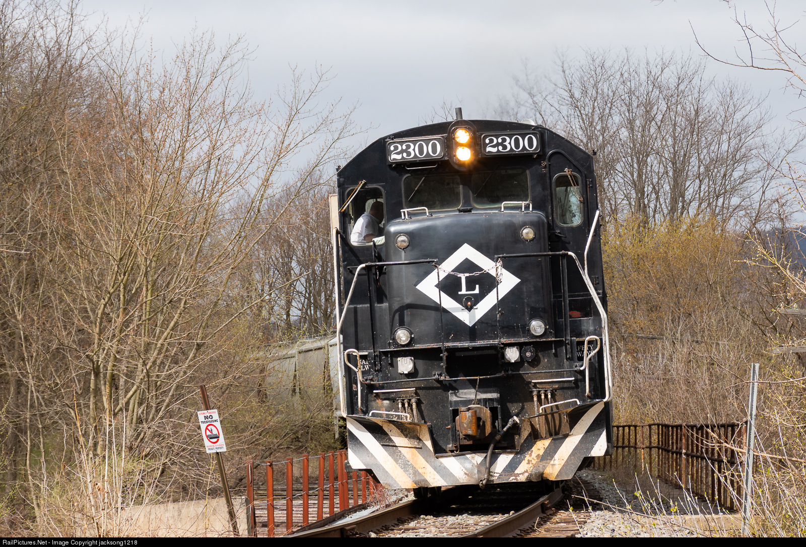 Lehigh Railway GE U23B number 2300 and EMD GP40 number 3002 back their train of loaded sand hoppers into the siding in Wysox as they cross over the Wysox creek.