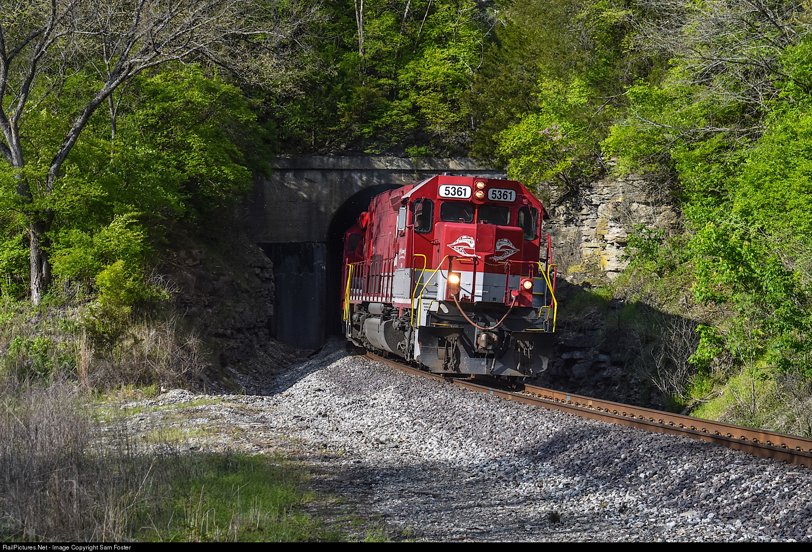 | A trio of RJ Corman SD40T-2s lead the Louisville to Berea empty slab train through one of the tunnels at Ford, Kentucky. |