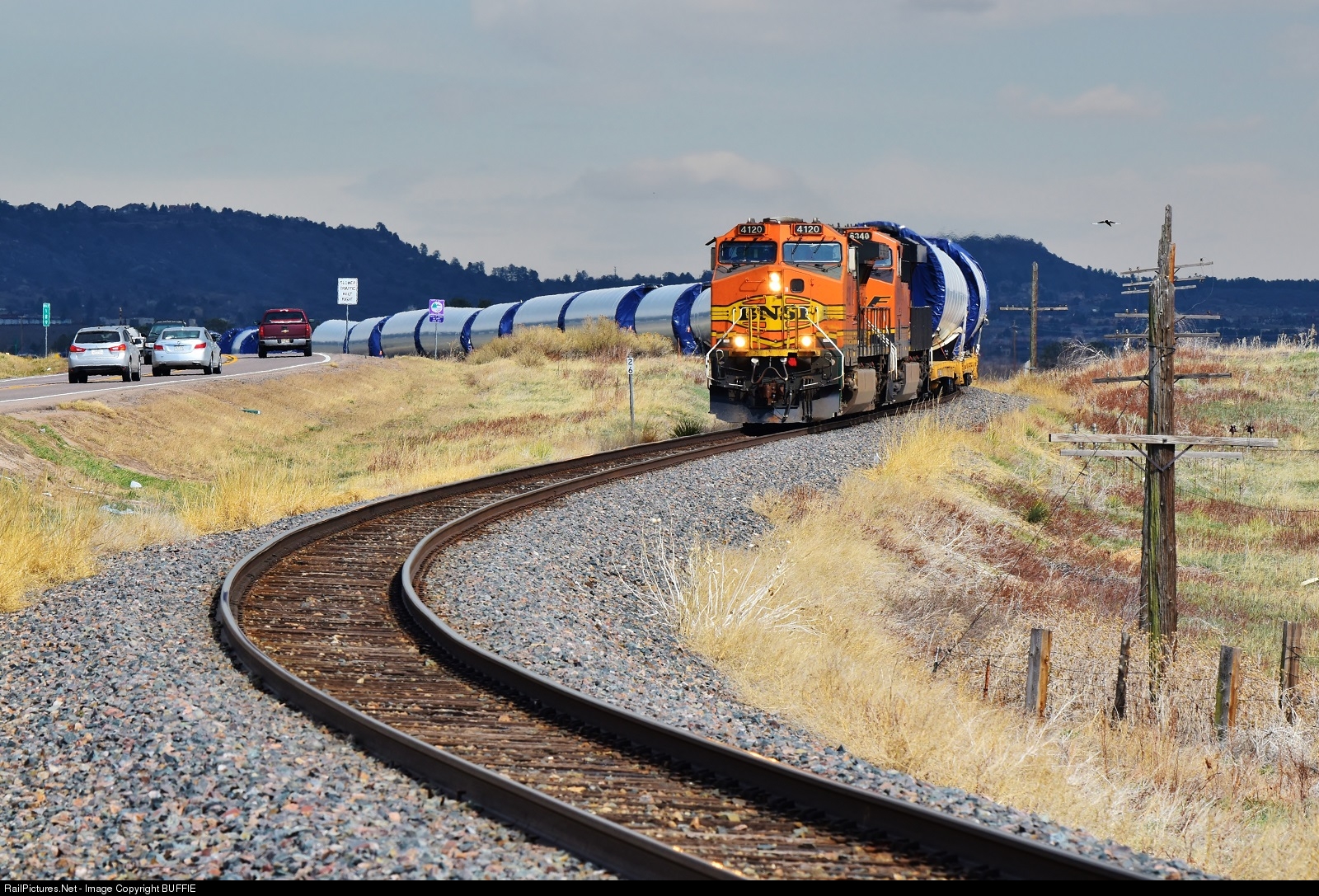 | As storm clouds build in the background, late afternoon sun shines on BNSF 4120 (Dash9) as it leads a windmill tower train through the S curves east of Sedalia, Colorado. Notice the Magpie that is pacing the train on the right side of the engines. |