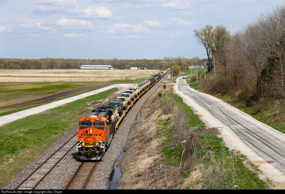 BNSF 6866 leads U FTLPAD1 15M out of Colona Illinois with a military train on a bright spring afternoon in the Quad Cities.